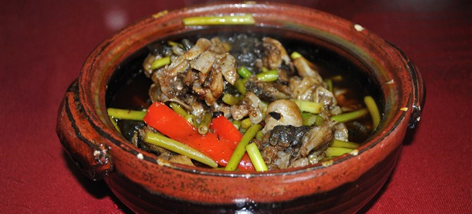 庐山石鸡是一种生长在阴涧岩壁洞穴中的麻皮蛙,又名赤蛙、棘脑蛙,体呈赭色,前肢小,后肢强壮,昼藏石窟,夜出觅食。它的形体与一般青蛙相似,但体大,肉肥,一般体重三四两,大的重约一斤左右。因其肉质鲜嫩,肥美如鸡而得名。