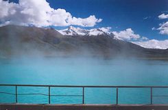 羊八井位于西藏拉萨市西北91.8公里的当雄县境内。过去只是一块绿草如茵的牧场,从地下汩汩冒出的热水奔流不息、热汽日夜蒸腾。热田地势平坦,海拔4300米南北两侧的山峰均在海拔5500~6000米以上,山峰发育着现代冰川,藏布曲河流经热田,河水温度年平均为5℃,当地年平均气温2.5℃。去羊八井主要是体验高海拔地区的温泉浴,洗去西藏旅游的一身征尘及疲劳。