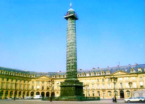 旺多姆纪念铜柱就坐落在广场的中央,由拿破仑皇帝下令建于1810年,是模仿罗马的特拉真(Trajane)柱修建的,柱高44米,用法国军队在奥斯特利兹战役中缴获的1250门大炮铸成,上面的螺旋形图案描绘着拿破仑征战的诸多场面,顶上立着拿破仑·波拿巴的铜像。