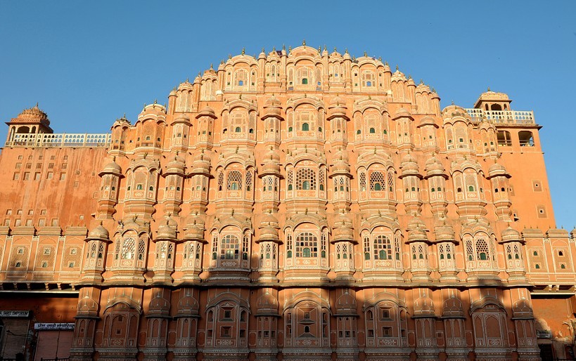 风之宫殿(Wind Palace)是18世纪中叶的建筑,位于斋浦尔中心。它采用传统伊斯兰式建筑,是哈普尔的地标建筑,也是印度建筑史上的杰作。这座五层式的建筑,从正面看来、好像一座巨大的宫殿,其实内部只是一片厚墙的宽度而已。墙上密密麻麻布满953扇窗,“墙”面极之浩大。墙后没有壮观大堂,没有华丽房间,只有如蜜蜂巢般的窗户,这些窗户是用红砂石镂空而成,呈半个八角形。窗户设计得无比巧妙,让凉风轻轻透进来,风凉水冷。从镶嵌有雕刻的窗户中,皇宫内众多王妃可以俯瞰街景和庆典,又可以不被丈夫之外的男子看见自己的面容。不过,窗户并非单为通风之用,而是为了方便古时宫中妇女观看外面的花花世界;窄小的窗户满足妇女们的好奇心,厚厚的墙壁则隔绝了抛头露面的机会。