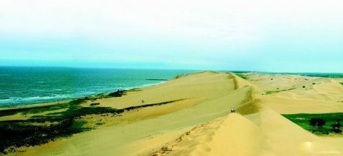据传由天空鸟瞰,这里海水的颜色反射出翠绿色,半岛三面环海,被包裹其中,故取名“翡翠岛”。 连绵起伏的沙丘与碧海、蓝天、绿林共同构成了翡翠岛罕见的海洋沙漠景观。这里绿树葱郁,浓荫覆盖,恰似一块镶嵌在湖边的翡翠。